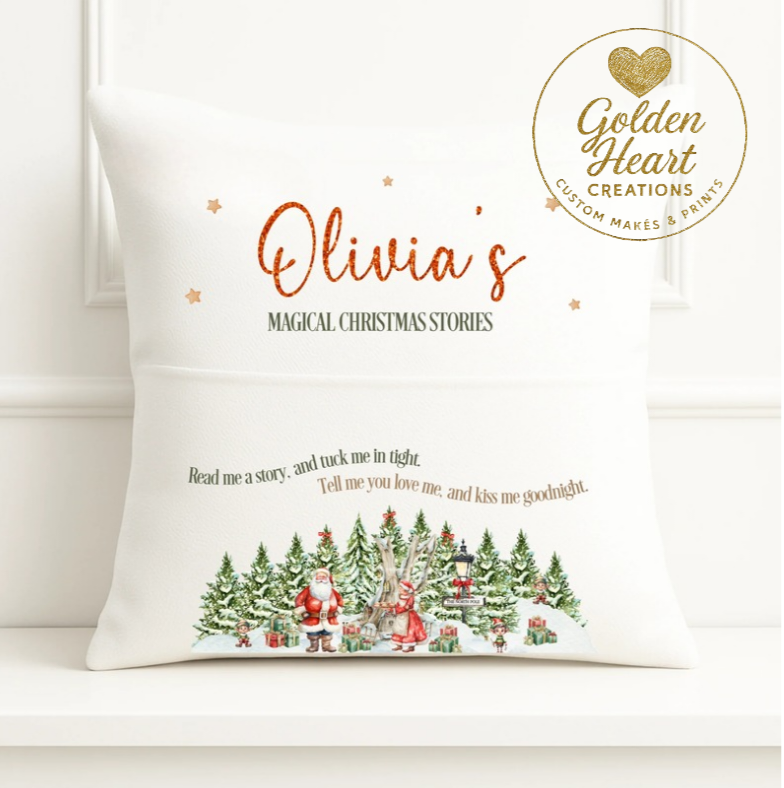 Make bedtime magical with this festive, custom-made pillow featuring your child’s name and a heartwarming bedtime quote. Adorned with a joyful Christmas scene—Santa, sleigh, reindeer, and gifts—it’s perfect for snuggling up and sharing seasonal stories. A beautiful keepsake for little dreamers and family traditions.