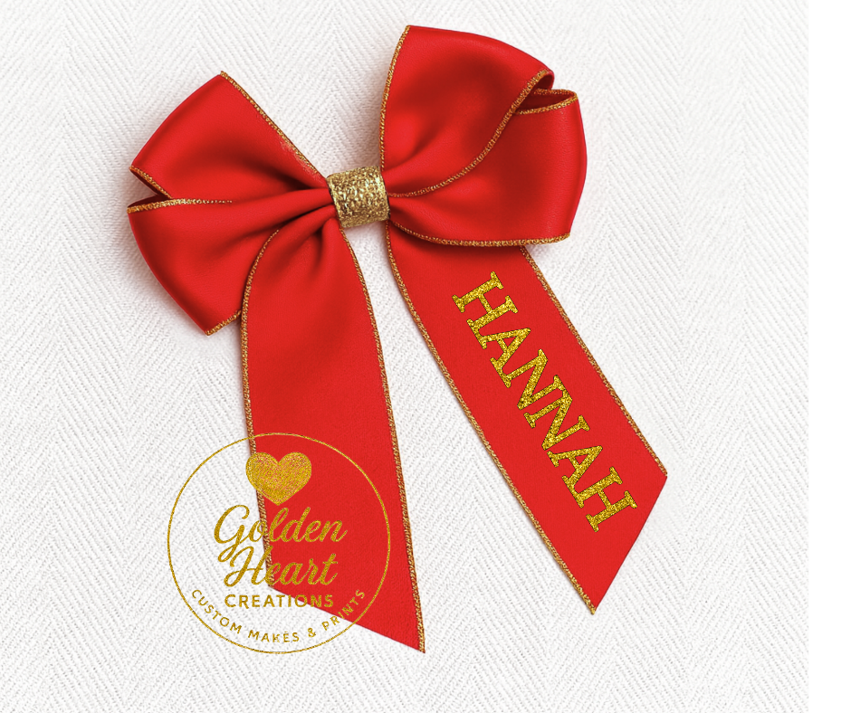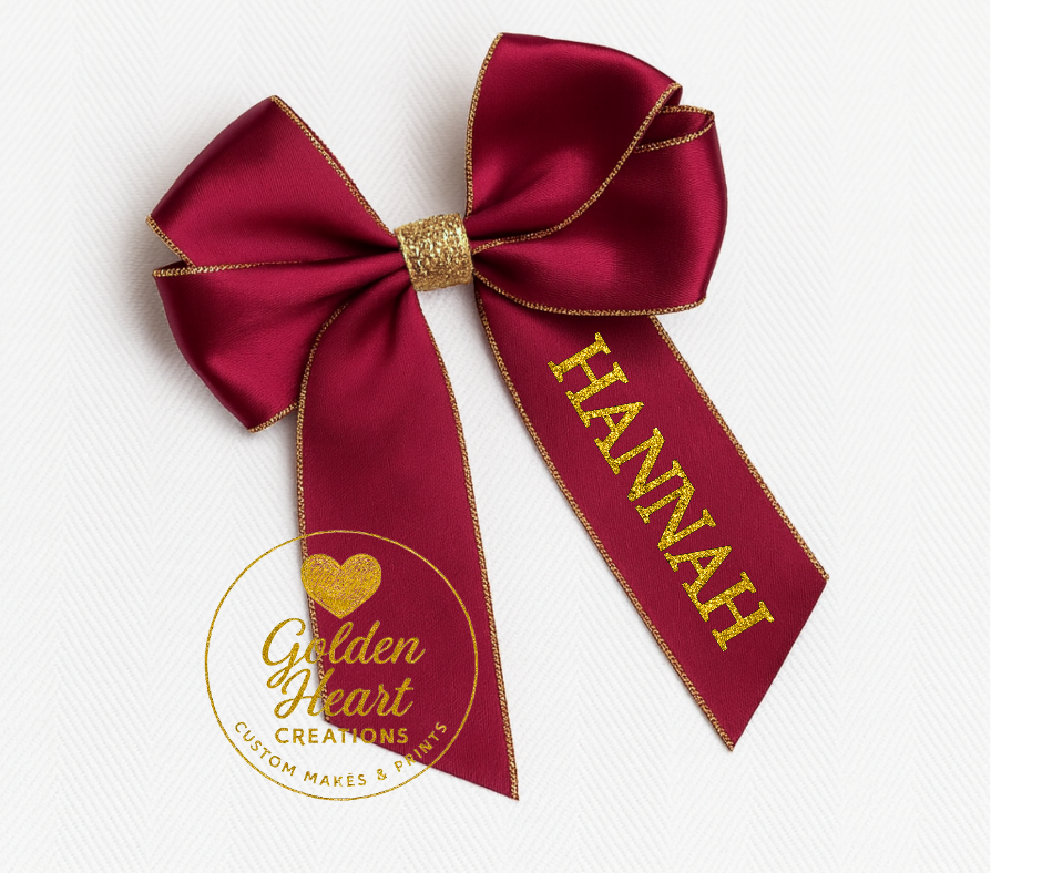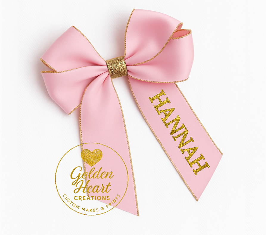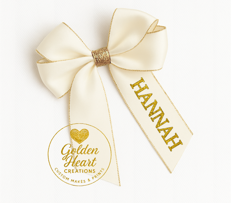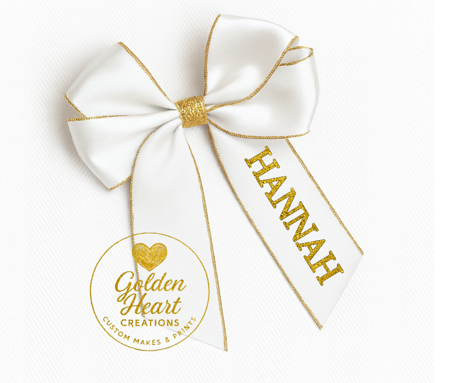 Elegant satin bows with gold trim, personalised with a name or word of your choice in shimmering gold.