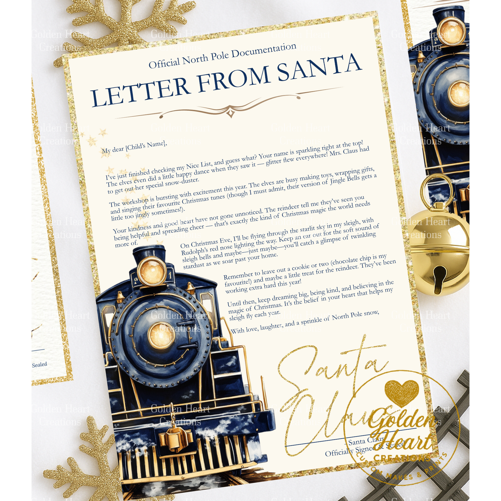 Featuring a festive North Pole train, shimmering gold accents, and space to add their name.